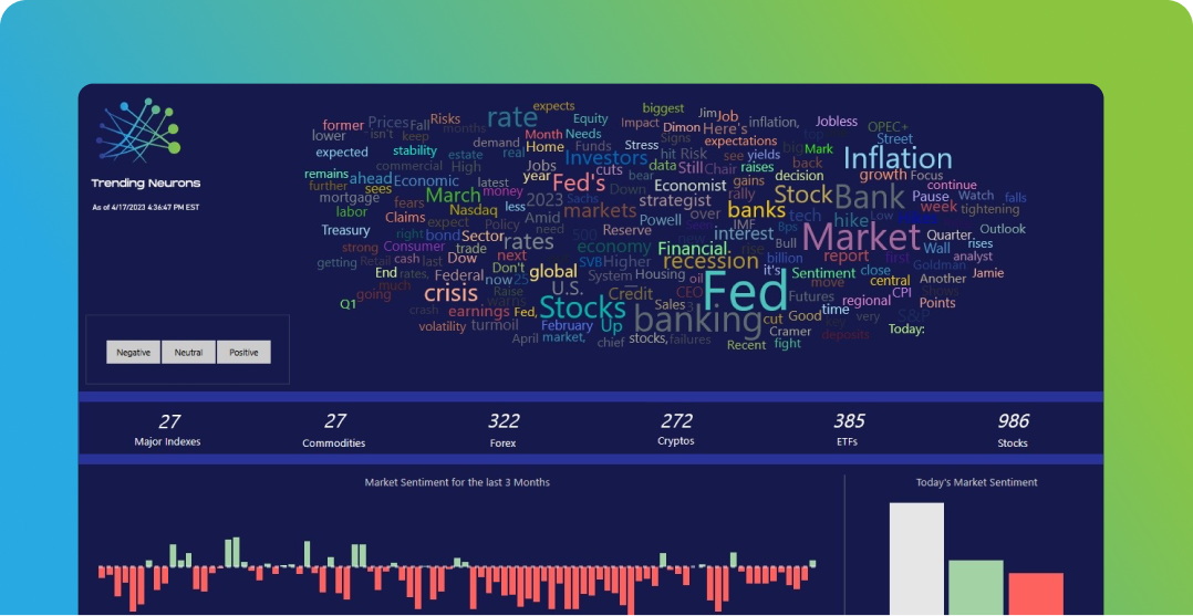 Trending Neurons aggregates a comprehensive suite of market intelligence — from fundamental and technical analysis to options data and sentiment tracking — into a single, patent-pending, user-friendly interface.Built on advanced machine learning and AI algorithms, our system delivers up to 93.7% accuracy across 36 global stock exchanges, predicting market direction and potential returns for the short term, mid term, and the next three months.A built-in generative AI chat assistant sits on top of the design, helping you interpret, navigate, and act — empowering you to make well-informed trading and investment decisions.