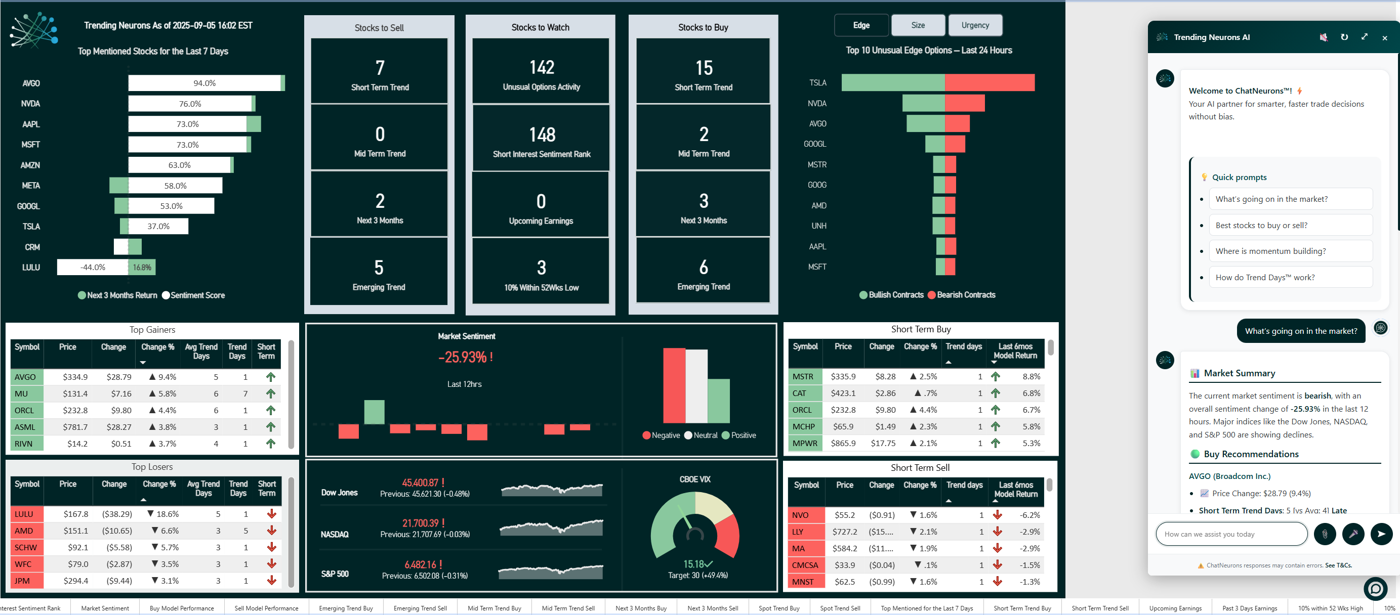 Trending Neurons aggregates a comprehensive suite of market intelligence — from fundamental and technical analysis to options data and sentiment tracking — into a single, patent-pending, user-friendly interface.Built on advanced machine learning and AI algorithms, our system delivers up to 93.7% accuracy across 36 global stock exchanges, predicting market direction and potential returns for the short term, mid term, and the next three months.A built-in generative AI chat assistant sits on top of the design, helping you interpret, navigate, and act — empowering you to make well-informed trading and investment decisions.